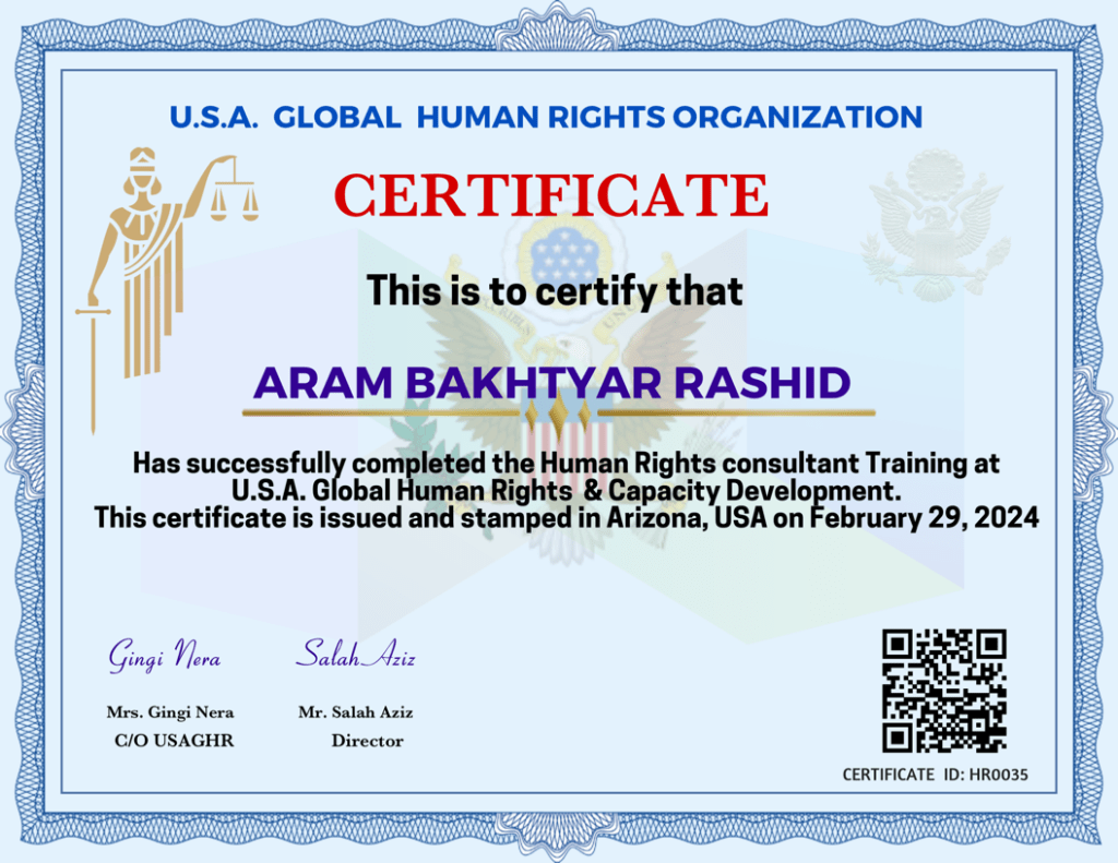 Has successfully completed the Human Rights consultant Training at This certificate is issued and stamped in Arizont, USA on February 29, 2024